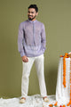 Shirt Kurta & Jacket Set- Lavender short Shirt Kurta in Chanderi Tissue with matching Silver Stripe Jacket and White Straight Pants. Kurta comes with half placket opening, Nehru (Manderin) collar, full sleeves with cuff. V neck Jacket has slash pocket for your pocket square. Straight Pants has utilitiy pockets.