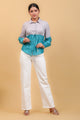 V Neck High Slit Chanderi Kurta in Aqua Blue Chanderi with gathered Sleeves. Color block effect on the stylized V shaped back matches the contrast piping along the high slits. The matching Pants in Cotton with Silver stripes and Chanderi Dupatta with Lime details. Kurta bodice is lined.