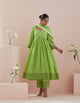 uchsia Pink Anarkali Kurta in pure Chanderi Handloom fabric, has embroidered yoke, and sleeves, With Fern Green facing on hem. Its paired with broad Palazzo in Fuchsia Cotton.