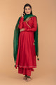 Chanderi Handloom A Line High Low Kurtawith Cotton Palazzo in Red & Deep Green Chanderi Dupatta (set of 3)