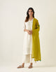 This stylized V- Neck Kalidar Kurta with Off White floral embroidery & lace inserts on the yoke, and quarter sleeves is made of Chanderi Handloom. It's paired with an Off White Palazzo and Cotton Dupatta with embroidered lace border. The Kurta comes with a matching cotton slip. A flowy outfit in subtle colors that work well in Office as well as get-togethers, made of breathable fabric just right for summers.