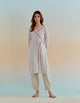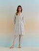 Kaftan Style Cotton Top comes with V neck and front box pleat, Lace details on the sleeves. It's paired with matching Pants in Cotton Glaze. A smart, comfortable outfit for your office wear.