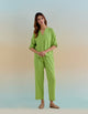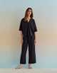 A Line Kurta has a box pleat in front for a flared fit. It comes with bell sleeves and an overlapping V neckline that has border details and lace inserts on the edges. The ditsy hand block print Cotton Kurta is paired with matching Pants that are ruched at the hem. A smart and comfortable outfit for your office wear.