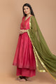 Sleeveless Anarkali kurta with loose fit palazzo pants in yellow cotton . Paired with contrast fern green dupatta in Chanderi fabric. Dupatta has multi colour border detail