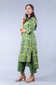 Chanderi Kurta with curvy Empire Line in Teal Green comes with a cropped Palazzo to match. Loose fit Kurta has Purple piping on the edges. The chiffon dupatta in Grape Purple has a lace border to complete the look.