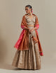 A timeless gold Zari Kurta has a V-neck with a loop and button opening at the front, adding a classic appeal to the outfit. Its paired with a Zari stripe Saffron Brown Sharara and embroidered Chanderi Dupatta. Sharara has a lace-finished hem to give it a glamorous and modern look.