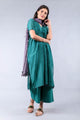 Chanderi kurta in Fuchsia has a yoke with intricate hand embroidery in gold threads. The neck line, slits and sleeves have Green detailing. The high- low hemline adds an interesting element to the garment. It comes with cropped Chanderi pants to match.