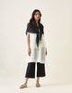 Loose Kaftan Style Kurta in White Cotton has contrast Black embroidery on the sleeves and the front, a box pleat at the back highlighted with Kantha stitches, and front button details. Kurta comes with side pockets. Kurta is paired with contrast Cotton Glaze Pants. Smart & light outfit that's fuss-free & comfortable; designed for a full day in the office.