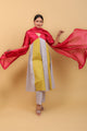 Multi Colored V Neck Paneled Kurta, Grey Pants in Chanderi & Cotton With Silver Stripes (Set of 2)