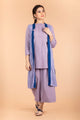 Shirt-inspired pinstripe Kurta with collar, front box pleat, and stitch detail. This paneled shirt kurta has a loose A-line fit with gathers on the back yoke. Hidden sweat pockets on the front with lace highlights. Paired with a wide-legged cotton palazzo in soft lilac cotton. A functional yet comfortable outfit for women for the office