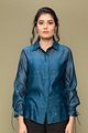Formal pinstripe cotton shirt with a twist of stylized V-neckline as a design element to your regular office shirt. Soft cotton with hand block printed stripes from Jaipur. Loose puff sleeves with cuff and button opening. A classic stripe shirt in a soft lilac shade that is easy to pair with denim or colored bottoms for a minimal office look