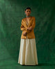 Featuring a Kalidar Lehenga, inspired by a chessboard puzzle, making a Silver and Gold Zari geometric pattern all over. It comes with a waistband and side zip closure. It can be paired with a Silver or Gold Zari Blouse and a Tissue Dupatta.