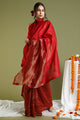 Straight cut kurta with slant V-neck in handwoven Red Chanderi. Adorned with red brocade lace at the neckline. Bottom wide-legged palazzo in red cotton. Completed the look with a deep green Chanderi dupatta with tassels.