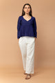 A solid white cotton Kurta with high slits and short sleeves. Detailed on the slits with indigo print pipings and with intricate white lace on neck and sleeves. Paired with straight fit pants in authentic Indigo block print from Jaipur. A minimal, comfortable set for summers.