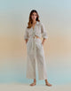 V-neck Top in ditsy hand block printed Cotton comes with ladder lace detail on the centre front and curved bottom. It's paired with matching Pants with side pockets and front zip closure. It's fully lined. A cool Coord set for easy and comfortable travel.