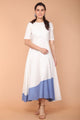A-line, ankle-length shirt dress in a serene white cotton fabric. Bottom hem with delicate mesh lace detail and front open with button placket. The dress has full sleeves with button tabs for a folded option. Wear this ankle-length dress for a minimal and comfortable look