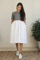 Colour blocked dress in Off...Gathered dress with block print jacket and belt in White and Print (2pc set)