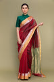 Handwoven Dark Forest Green Chanderi with a broad border in Gold and Silver, is an amalgamation of traditional technique and contemporary look.