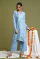 Anarkali styled Kurta in soft handwoven Chanderi. Delicate embroidered Lace edgings on sleeves and bottom hem. Straight fit Cotton Pants with Pintuck and Lace detail. Soft Mint combination is paired with an Ivory/ Off White Dupatta in handwoven Chanderi Silk with Gold Zari motifs at the edges.