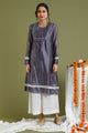 This set has a high-slit kurta in authentic handwoven Chanderi fabric and straight cotton pants in Jaipur block print. The straight kurta has clean cuts with a high neckline and a slit on the front side. The slit shows through the straight, relaxed fit printed cotton pants as a contrast.