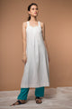 A solid white kurta stylised into a razer back strappy neck and intricate kantha embroidery in yellow & blue on the neck band. Paired with pyjama style pants in a contrast aqua blue shade. This indo-western set in soft and airy cotton is a perfect piece for indoors and outdoors.