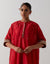 Designed in a rich Red hue, the Kaftan features delicate floral embroidered motifs all over, along the front placket, and is finished with intricately embroidered lace trims on the sleeves. The lightweight Chanderi fabric adds a graceful sheen and effortless drape, strikes the perfect balance between minimalist elegance and festive flair. -