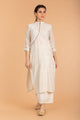Shirt inspirited Kurta with collar, front box pleat, and stitch detail. This paneled shirt kurta has a loose A-line fit with gathers on the back yoke. Hidden sweat pockets on the front with lace highlights. Paired with a wide-legged cotton palazzo in Red. A functional yet comfortable outfit for women on the go.