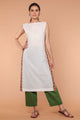 A solid white cotton Kurta with high slits and short sleeves. Detailed on the slits with indigo print pipings and with intricate white lace on neck and sleeves. Paired with straight fit pants in authentic Indigo block print from Jaipur. A minimal, comfortable set for summers.
