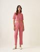 Rose Pink Kurta has gathered Raglan Sleeves with Kantha stitch details made in a breathable Chanderi Handloom. Kurta has a keyhole button closure at the back and is paired with Cotton Glaze Pants, a Cotton under slip. Experience the luxury of a breathable handwoven Chanderi subtle Rose Pink outfit, designed as office wear; cool yet classy.