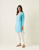 A classic sleeveless V- neck Short Kurta in White Cotton is paired with a matching Salwar that has embroidered hems in contrasting Black. Kurta is lined. A Black & White Set with a touch of embroidery is a unique and smart outfit for the office.