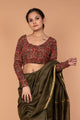 Hand block printed cotton blouse in fresh pink and indigo print. A deep U neck, quarter sleeves and front button opening. Pair this lightweight breezy cotton blouse with a saree for a regular day outing