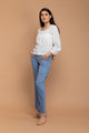 Raglan sleeve Top in Textured Cotton dobby. It has a gathered neckline and sleeves with print pipings. Beautiful hand kantha work on the front. A flowy, comfortable top for everyday look