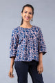 Hand block printed cotton top with a pleated panel on the front, adding flare to the bottom. Scallop lace details in blue on sleeves and hem