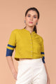 A solid Ochre Yellow Shirt in regular fit, accentuated with gather detail creating puff sleeves. Ric rac lace finish on the cuffs, with elastic. Pair this classic shirt with denims, pants or skirts to create a formal office look.
