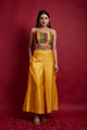 Featured multi-colored spaghetti Top in Chanderi with zig-zag Zari weaves, with cut dana embroidered lace trims on the neck, gold scallop lace on the waist, side zip closure, and adjustable straps. Paired with Chanderi Palazzo in Turmeric Yellow and Chanderi Dupatta in Maroon with woven gold stripes, a stitched Zari border with fringe Lace all over. The Palazzo and Top are lined. Outfit for those who prefer to balance the modern with traditional appeal and carry it with élan. Smart & fuss-free occasion wear. A tribute to handlooms.