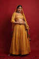 Featuring Turmeric Yellow gathered Lehanga in soft handwoven Chanderi, comes with a smocked blouse that's true to size, specially designed to give the perfect fit for all body types & curves. With Gold scallop lace trims on the waist, the Lehenga is paired with a Blouse in zig zag zari weave with embroidered lace trims on the gathered sleeves. Wear it as is or style it with a Green, Yellow or Pink Dupatta of choice. The outfit is designed for the haldi ceremony, for the bride who favors subtle. It's lightweight fuss-free occasion wear. Accessorize it for a family wedding and swing along stress-free.