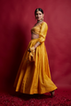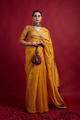 Featuring Turmeric Yellow gathered Lehanga in soft handwoven Chanderi, comes with a smocked blouse that's true to size, specially designed to give the perfect fit for all body types & curves. With Gold scallop lace trims on the waist, the Lehenga is paired with a Blouse in zig zag zari weave with embroidered lace trims on the gathered sleeves. The set also includes a handcrafted Chanderi Dupatta with Olive Green & Pink facing all over, Gold Zari & Pink border on the edges. The outfit is designed for the haldi ceremony, for the bride who favors subtle. It's lightweight fuss-free occasion wear. Accessorize it for a family wedding and swing along stress-free.