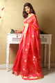 This Mustard Yellow handcrafted Saree, has Meenakari motif in red and gold which adds to its unique appeal. An exclusive feather light saree, its fit for luncheons, tea parties and outings. Team it with a blouse in same fabric, or red halter top. Accessorize with gold danglers or stone jewelry.